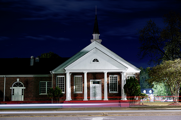 Brown Memorial Presbyterian, a red-brick church with white columns, stands prominently against a deep blue night sky, its architecture punctuated by a small steeple. Light trails from passing vehicles create dynamic lines across the foreground, adding a sense of movement to the serene setting.