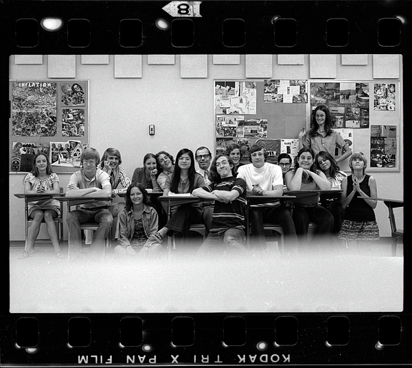 Students from Mr. Clay's AP English class, spring 1972. Full-frame image shows film edge data and is slightly obscured by a desktop on which the camera rested.